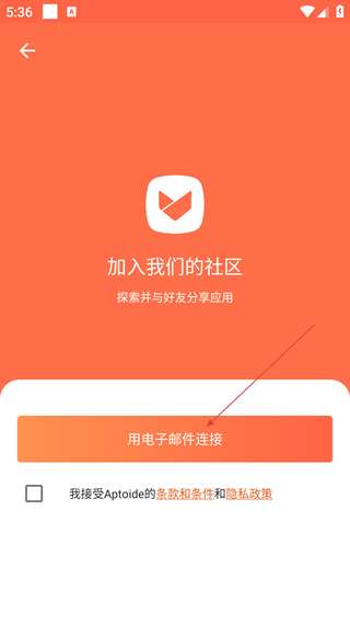 3、在注册界面选择“通过邮件连接”,需要先查看接受条款和隐私政策。该应用程序支持社区功能,需要注册。