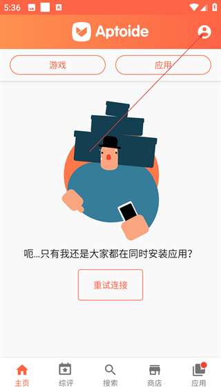 1、Aptoide是第三方安卓应用商店,其首页分为【游戏】和【应用】两个板块。如果遇到连接问题,可以点击“重试连接”恢复访问,该功能支持用户自建应用商店。