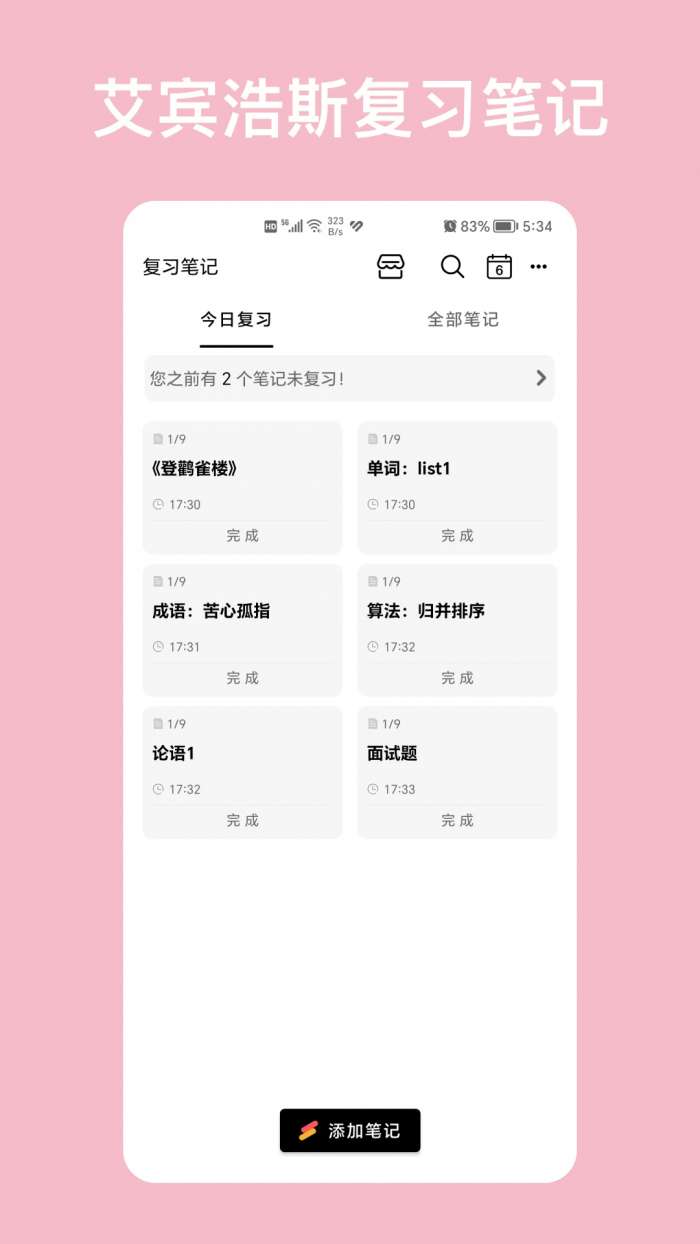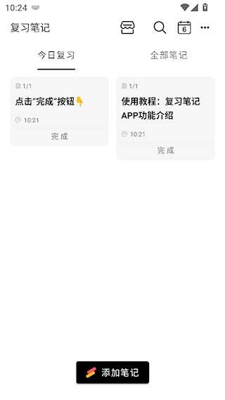 1、进入复习界面,可以看到今日需要复习的笔记,复习后点击笔记下的完成。