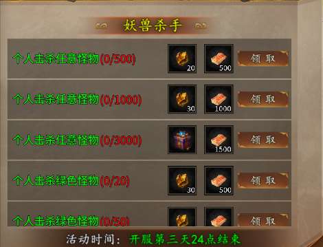 2、在开服前三天内完成任务规定的击杀任务可以获得丰厚的奖励。