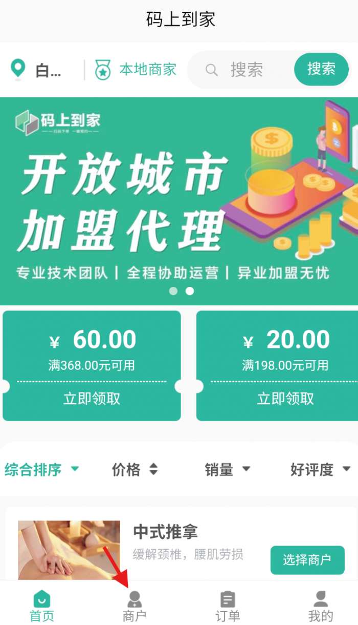 1、打开码上到家软件,在导航栏中找到 “商户” 选项并点击,进入到与商户相关的页面。