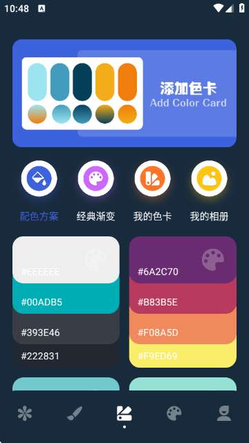 6、进入色卡管理界面,您可以使用“配色方案”、“经典渐变”、“我的色卡”、“My Album”等功能来管理个性化色卡,并为图像创建提供颜色支持。