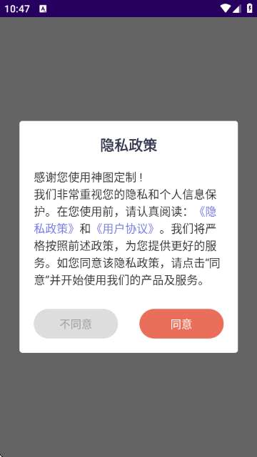 1、打开应用程序后,将弹出“隐私政策”提示框。仔细阅读“隐私政策”和“用户协议”后,点击“同意”进入主界面;如果你点击“不同意”,你将无法使用该应用程序的功能。