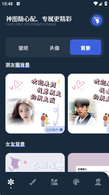 4、选择“背景”部分浏览类别,如“时刻背景”和“女朋友背景”。点击“立即创建”进入编辑界面,设计专属背景图像。