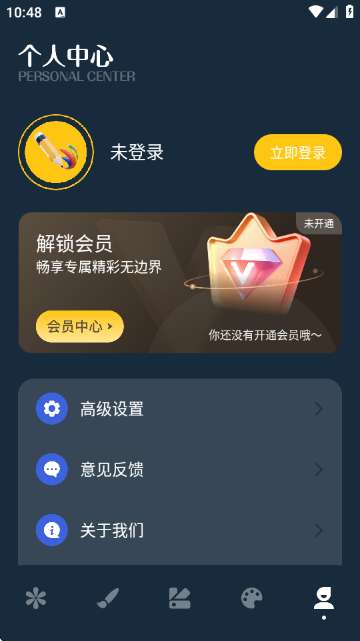 8、点击底部的“我的”选项卡进入个人中心,在那里您可以执行“高级设置”、“反馈”、“关于我们”等操作,并管理您的个人帐户和应用程序设置。