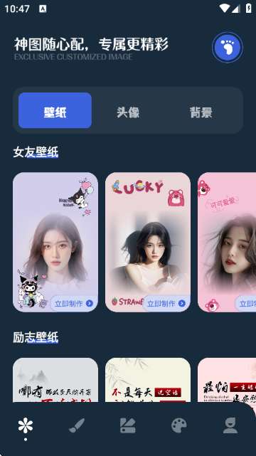 2、进入主界面后,选择“壁纸”部分浏览“女朋友壁纸”和“励志壁纸”等类别。点击“立即创建”进入相应的壁纸编辑界面,开始定制专属壁纸。