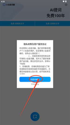 1、打开软件,点击同意用户协议及服务政策。