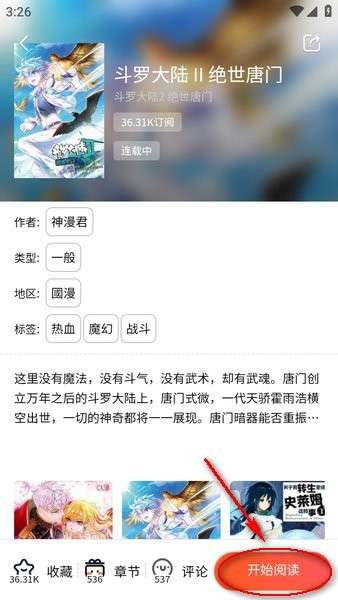 3、选择要观看的漫画,就会进入详情界面,点击右下角的“开始阅读”。