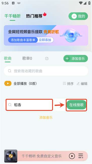 1、打开app进入【千千畅听】专区,输入歌曲名后点击“在线搜歌”。