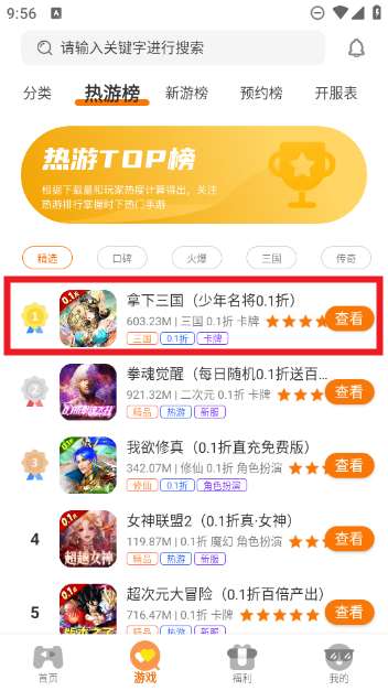 2、首先玩家需要找到自己想玩的游戏,如上图所示,不知道玩什么的朋友可以借鉴热游榜。