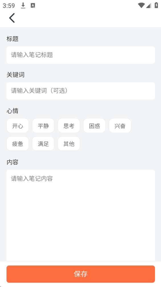 4、在填写界面,输入标题、关键词、心情、笔记内容后,点击“保存”按钮.
