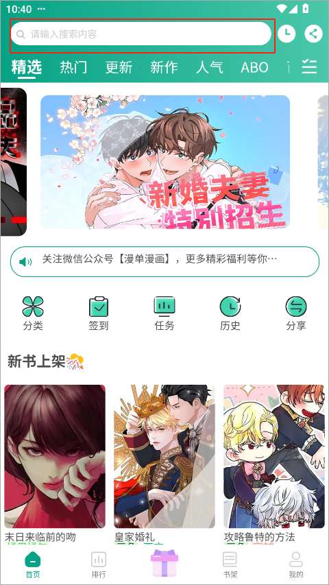 1、打开漫单漫画app进入首页,可以在搜索框中搜索想看的漫画,也可以在精选、热门板块找