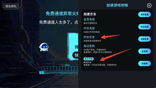 5、发现免费渠道人太多,可以通过做任务或邀请好友方式来获得免费时长和免排队福利。