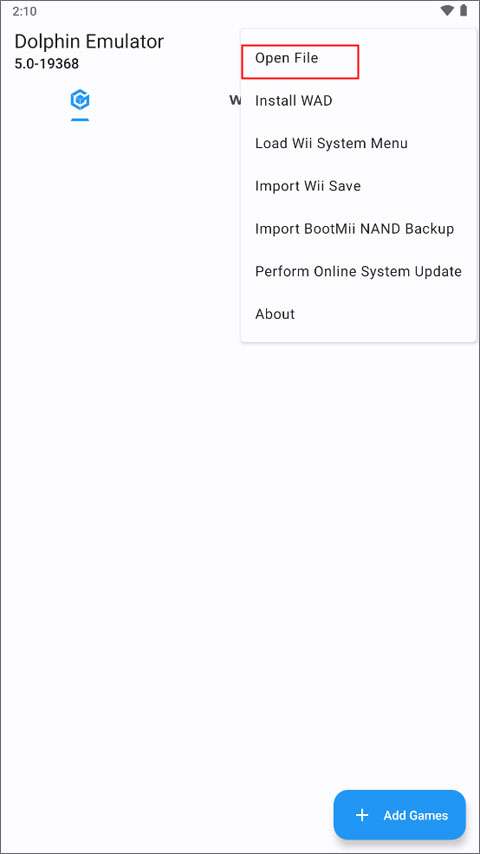 1、想要将手机上的游戏导入进来,首先点击右上角三点中的“Open File”或右下角的“Add Games”。