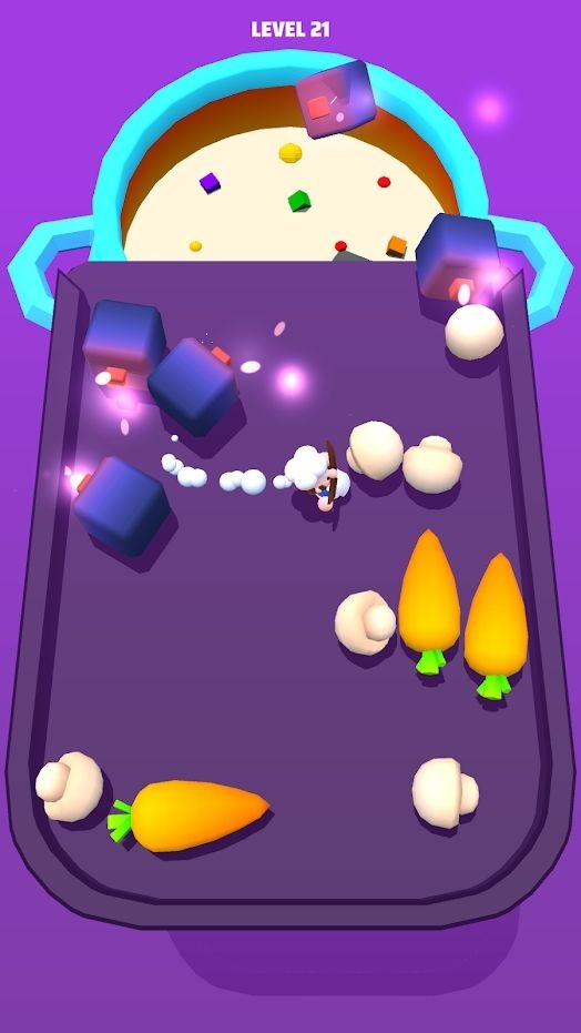 1、场景前方有一个大锅,而玩家要做的就是躲避场景中的炸弹,并把所有的食材都丢进锅里。