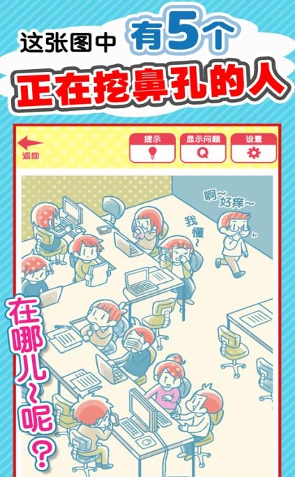 1、每一个图片都会让你找出一些什么东西,比方说看漫画的人打瞌睡的人吃东西的人。