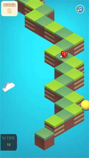 游戏中玩家可以点击手机屏幕让游戏中的小球跳跃起来,随着小球的不断滚动,在重力加速度的影响下,小球移动的速度会越来越快,操作的难度也会越来越高,不断地左右移动来控制小球,捡取游戏图中的道具,挑战更高的分数突破自己的极限。