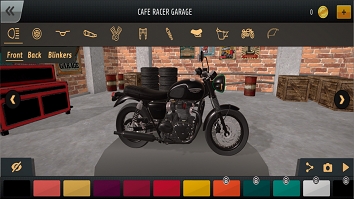 咖啡馆赛车这里你拥有一个咖啡馆的地下车库,里面有不同的摩托车零件,提供给你来组装完成一个汽车样式的打造之后就可以骑着它去完成一些赛道比赛了。游戏是横屏操作的,大家通过不同的组装零件按钮来选择你想要的然后选择一些颜色进行改装就可以我的一辆新的摩托车,有的零件是需要你通过比赛来获得的。再说也会有不同的赛场模式给你选择,可以先从简单的开始。