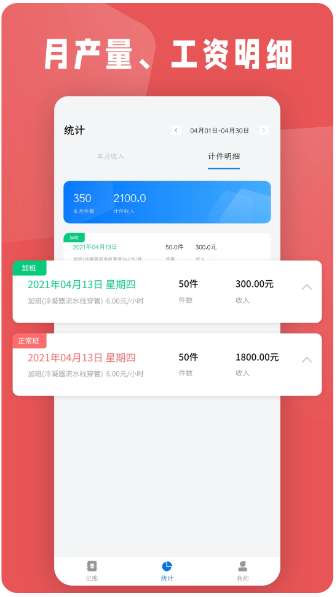 3、【每月工资统计】:清楚显示你一月日常班、加班产量,精准计算每月工资,让你的工资一分不少。