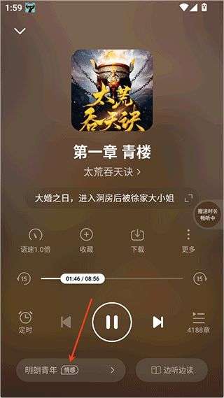 1、用户在收听小说和书籍资源时,可以点击收听界面上的底部声音模式选项。