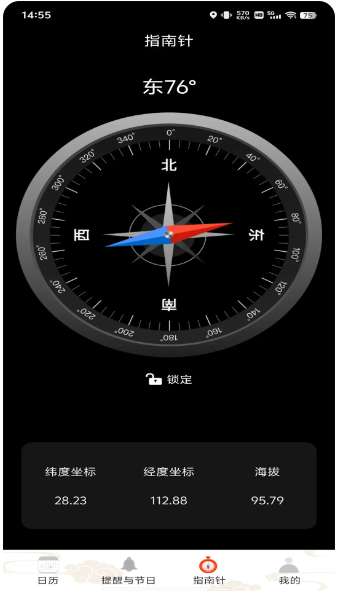 4、指南针 软件为用户提供指南针,使用户可以方便地识别方向,知道当前的纬度和经度。