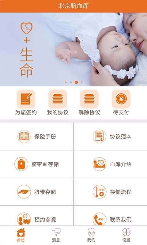 1、打开北京脐血库APP,在首页上可以查看签约、我的协议、付款等功能。