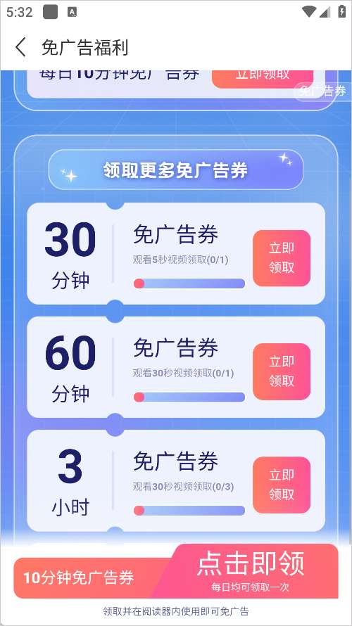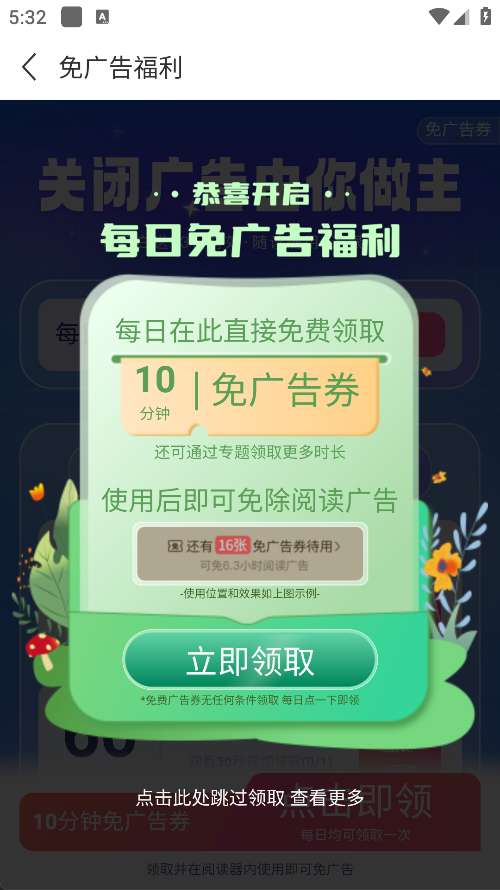 2、进入后,您可以看到无广告福利。点击“立即索赔”以生效。