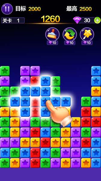 1、银河风暴连消特效:点击两个及以上同色星星触发连锁消除,粒子光效与动态音效结合,打造沉浸式视觉盛宴。