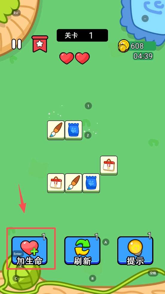 3、如果遇到困难,点击“加生命”按钮,增加生命值,继续游戏。