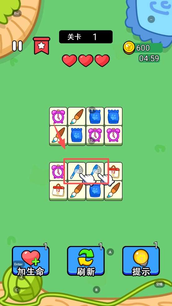 2、在游戏中,找到并点击相同的图案进行消除,完成关卡目标。