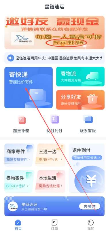 1、在首页中为用户提供了寄快递、寄物流、退件到付、本地生活等服务。