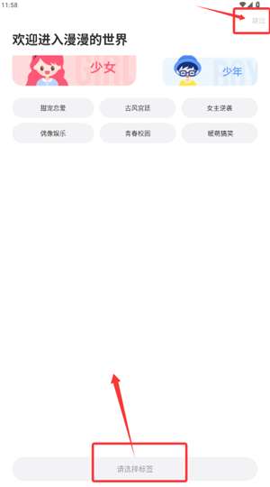 1、打开漫画软件后,可点击右上角跳过标签选择,直接进入首页。