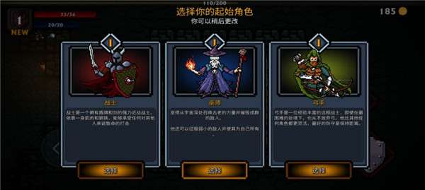 7、游戏开局会有三个角色,战士、弓箭手、巫师,不同角色技能是不一样的,玩家可以自己慢慢探索下哦。