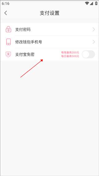 4、打开“支付宝免密码”按钮。
