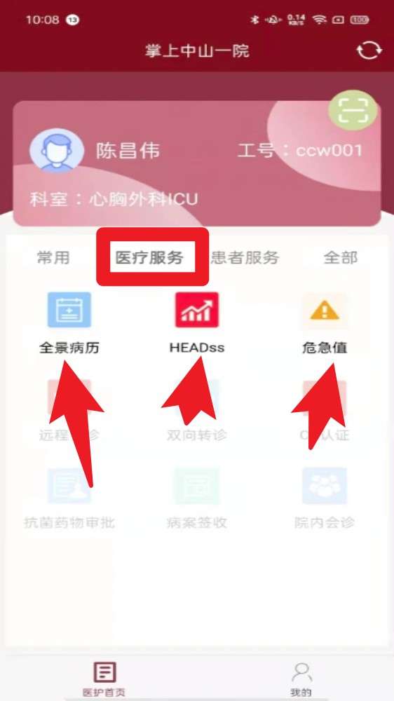 3、在导航栏点击“医疗服务”分类,可进入“全景病历”“HEADss”“危急值”等功能模块处理相关业务。