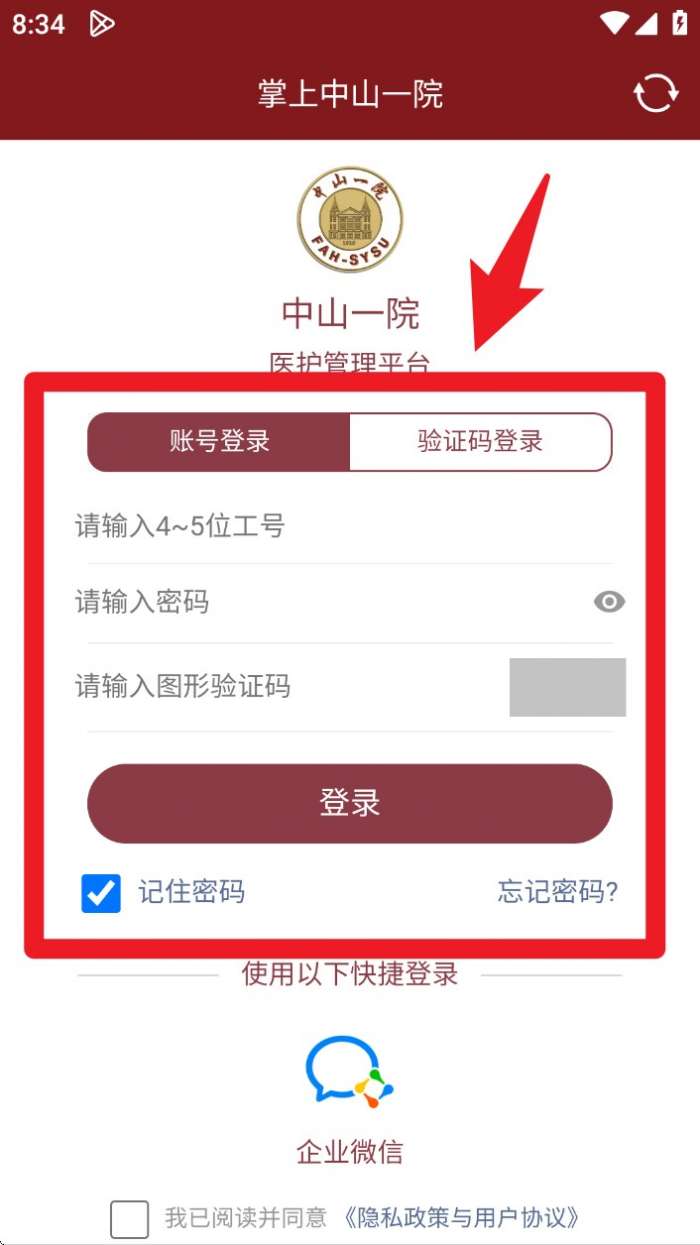 1、打开掌上中山一院 App,选择“账号登录”或“验证码登录”,输入工号、密码和验证码后点击“登录”进入系统。