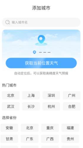 2、进入添加城市界面,可以选择热门城市或直接定位。