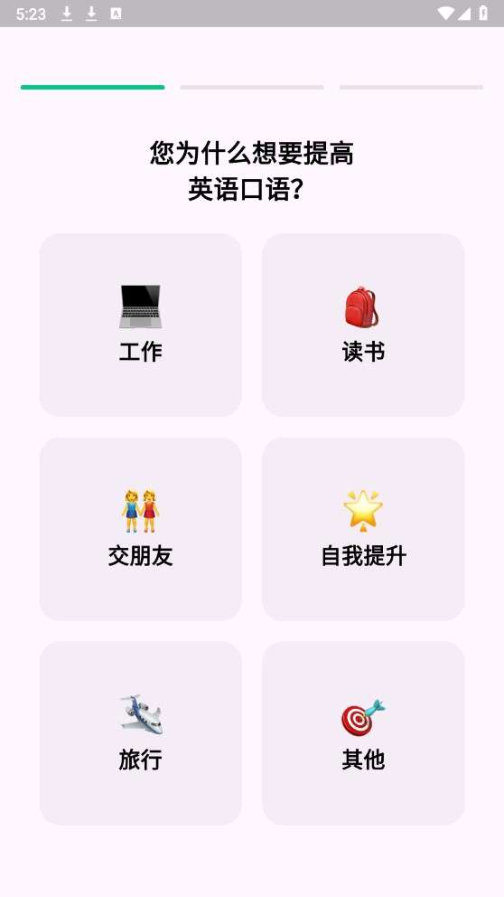 2、进入首页,首先需要回答几个学习英语口语相关的问题,以便更好的为你制定学习任务以及计划。
