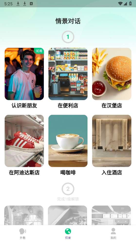 4、点击“情景”栏目,提供了很多的情景对话,方便用户进行练习。