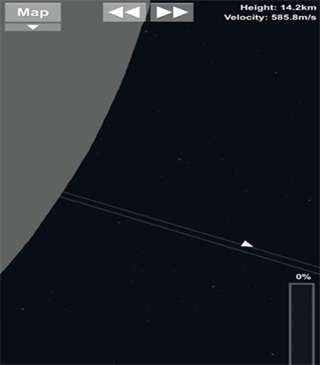 在任意一个拱点减速,直到轨道变成一条几乎重叠的抛物线。继续向下减速,让抛物线的顶点降低。着陆器预备(请不要在意这个低仿的空中吊机)。进入行星大气层,继续减速。不推荐新人去登陆没有大气的星球,因为降落伞无法展开比较难控制。如果登陆器是要重复回收利用的,尽量不要打开降落伞,直接用发动机来控制速度。成功着陆(图6)着陆速度不应该超过3米每秒,不然登陆器可能会摔坏。抛掉起重机。