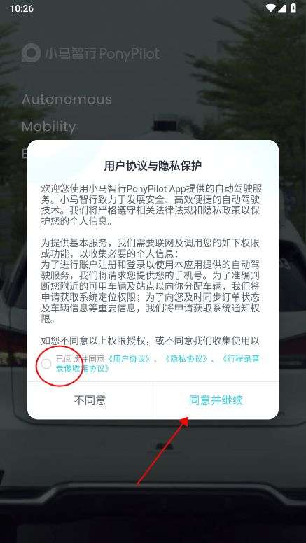 1、下载小马智行app安装之后,首先要求确认用户协议与隐私保护。
