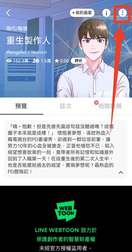 1、打开软件进入漫画详情页面后,点击右上方【三个点】。