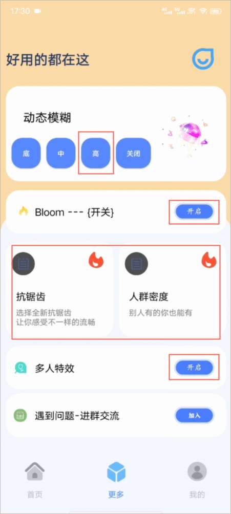 4、接着来到更多页面将页面中的特效、动态模糊都开启。
