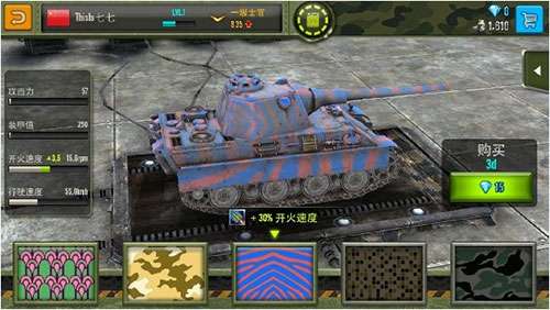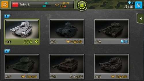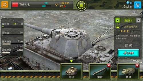 4、坦克展示可以提前预览你目前不可以得到的坦克。好的坦克要用钻买,要用人民币,其它的可以用军费买,军费在战斗中捡拾即可。买坦克还要等级,等到一定等级才可以买好的坦克,等级高了才可以开新图。