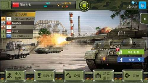 2、进入游戏界面,有个人档案,排行榜,设置,坦克展示和开始。旁边的红色感叹号是聊天信息,可以和外国玩家一起聊天,只是不知道在说什么。一个是世界,一个是军团的。军团要加入的话,点击世界里面邀请人的国旗后点击进入,会有团名,申请加入即可。然后才可以军团聊天。