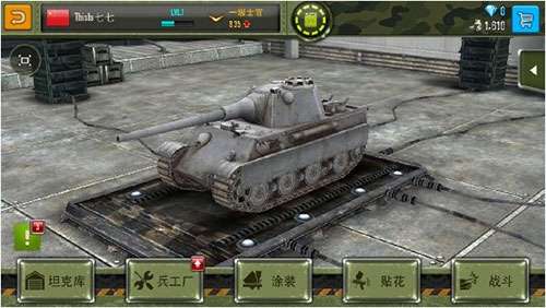 5、点击开始,进入游戏备战室,这里有坦克库(选择你要上场的所拥有的坦克),兵工厂(可以升级装甲、炮管、引擎等),涂装(坦克花纹,可以增加攻击力和开火速度)以及贴花(标志,可以增加攻击力和速度),其中涂装和花纹用钻石买,而且有时间使用限制,大概两天就消失。