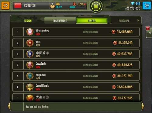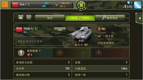 3、进入个人档案,有军团信息和个人信息。个人信息是你的比赛记录。军团内有职务之分,最高为军团长,次之为副团长和参谋长。进入全球排名前250名,团内成员均可获得总数为200钻的奖励,职务越高,分的越多。职务的提高靠战斗中所获得的胸章和击杀数量。