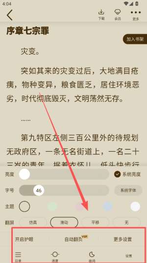 3、阅读时,点击屏幕中央可以打开菜单栏。在这里,您可以调整字体大小、背景颜色或打开夜间模式来保护眼睛。