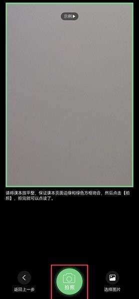 4、若里面没有你要的课本可以点击拍课本功能,然后将课本放平,保证课本页面边缘和绿色方框吻合,然后点击拍照就可以点读啦。