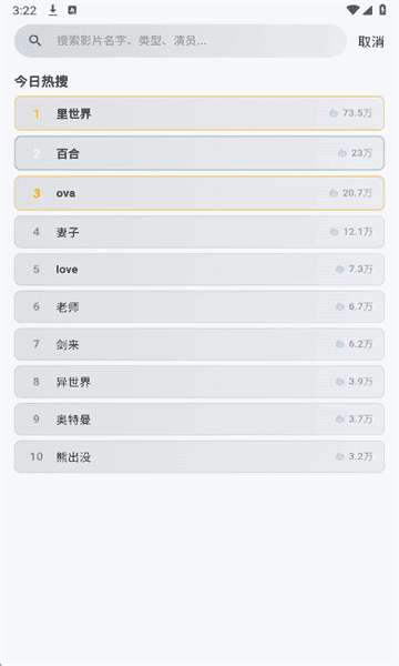 2、点击搜索框,有今日热搜,输入动漫名就可以查找;